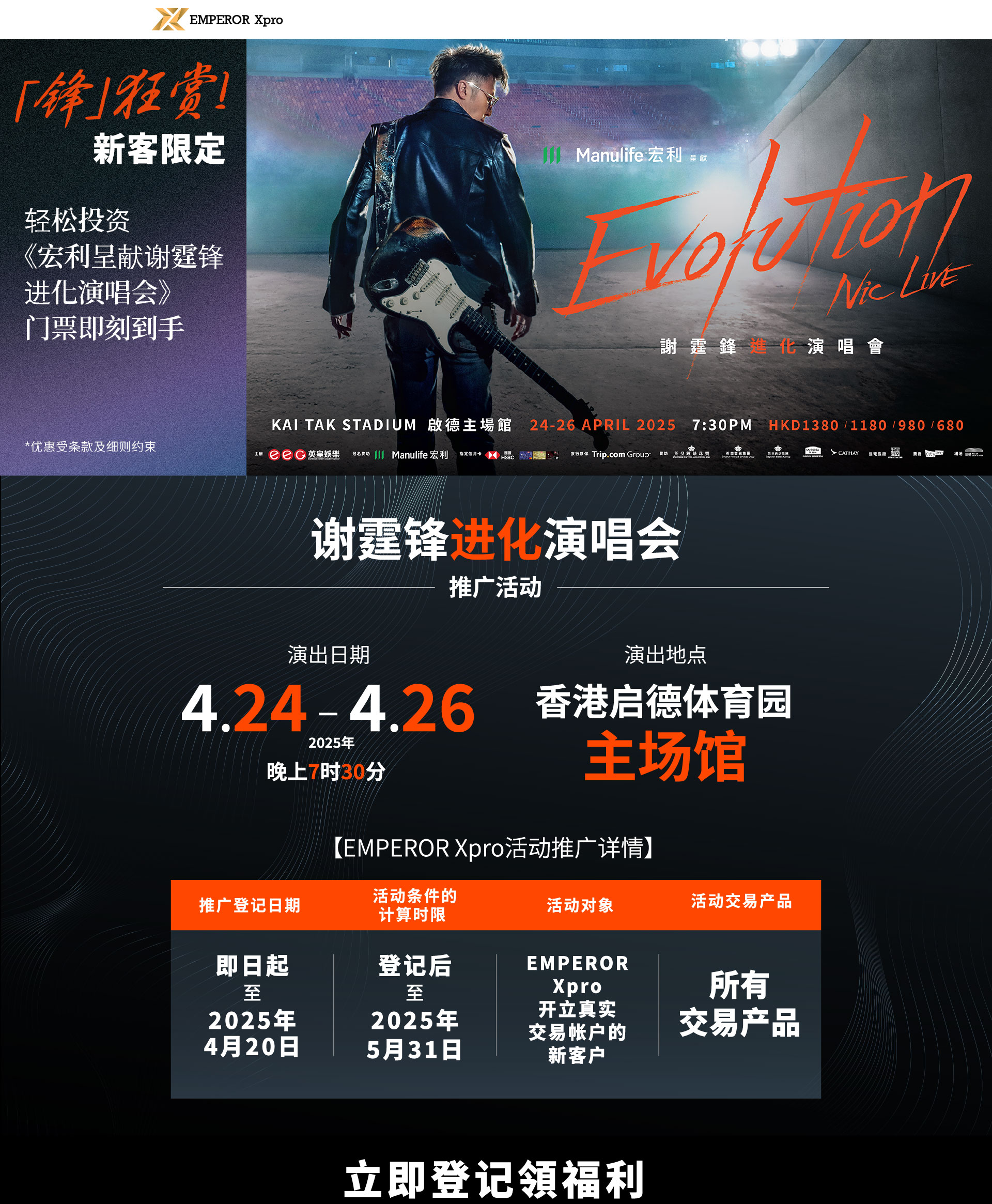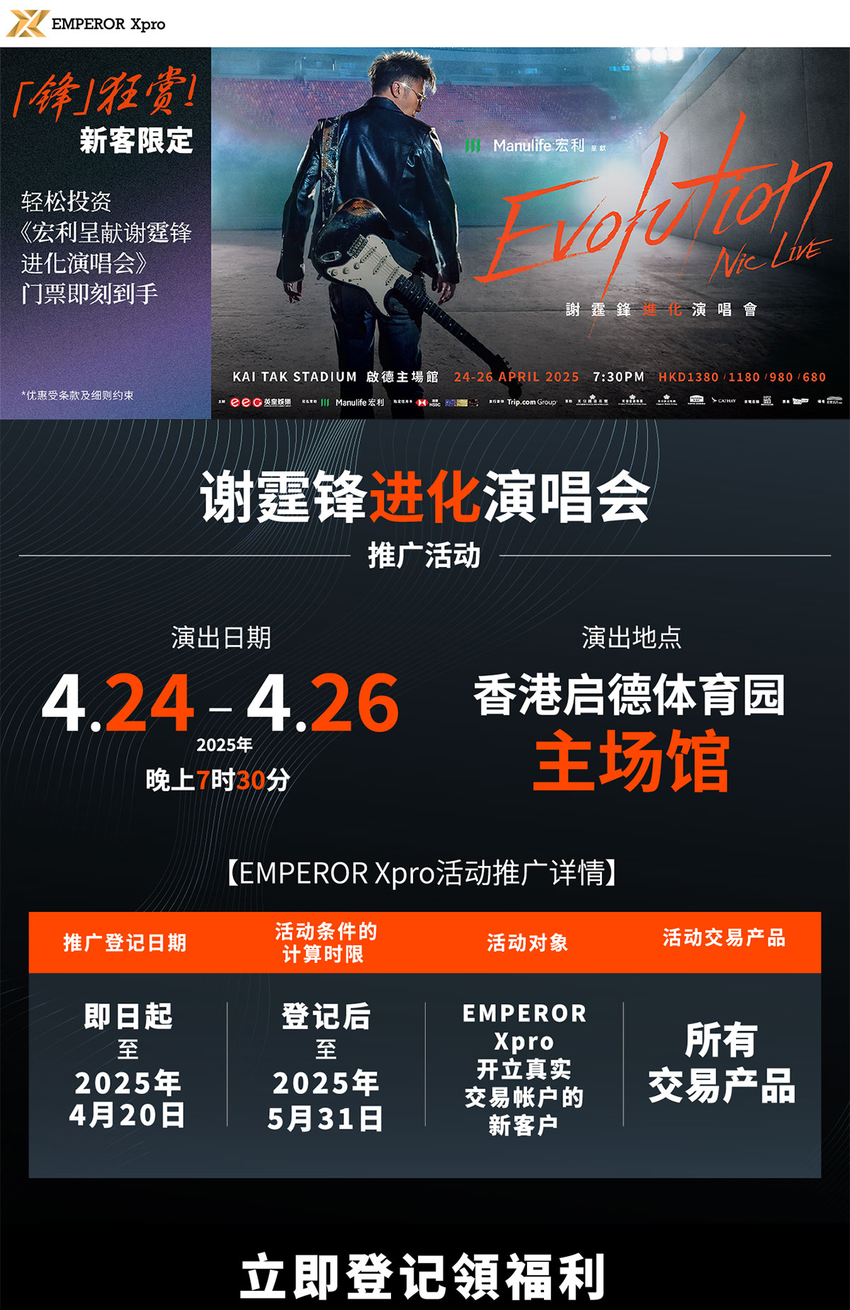 - 于之前版本条款及细则下被定义为「全新客户」 (即 2025 年 2 月 1 日前首次开户),但于此低门坎推广活动中不再符合「全新客户」定义之客户,若于 2025 年 4 月 20 日前已完成 US$4,000 之存款及 2 手交易要求,将自动获得购买 2 张 HK$1,380 门票之资格。